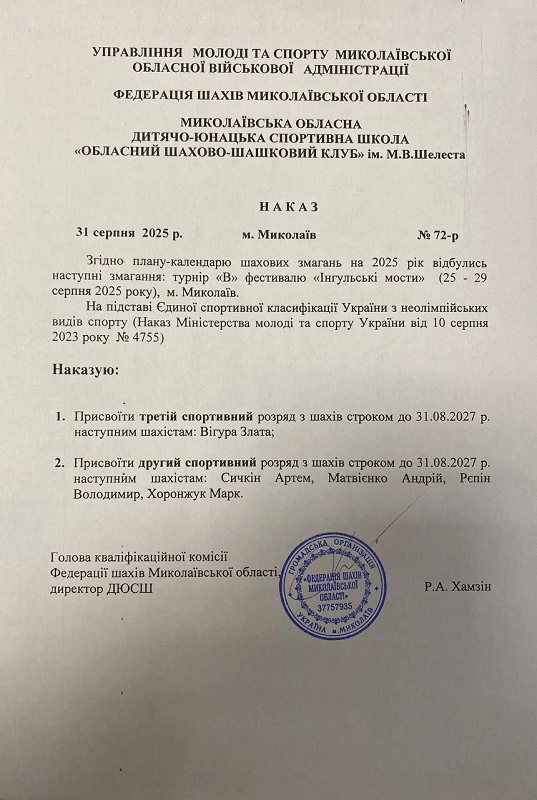 Список шахматистов Николаевской области, имеющих действующий 1-й разряд